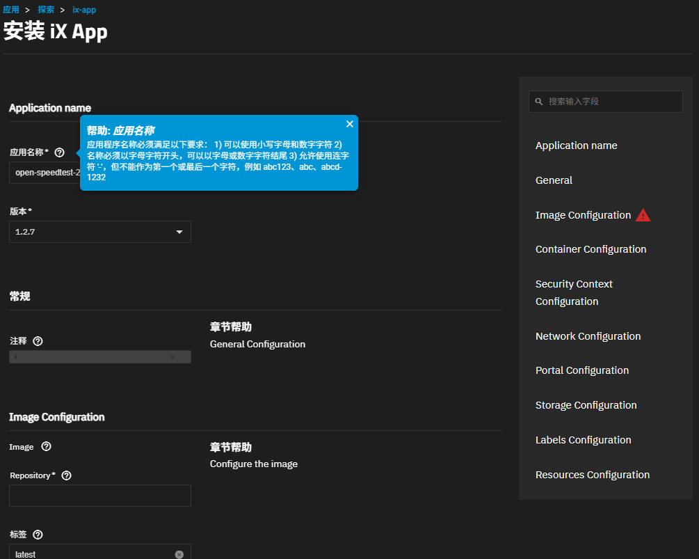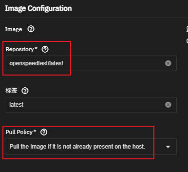 Repository(源):填写的就是前面找到的镜像完整名称,例如“openspeedtest/latest”。注意Tag不要写在这里。