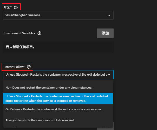 Restart Policy(容器重启策略):一般都选“Unless Stopped”,应用进程被外部杀死后 Docker 会自动重启,但应用自身启动失败不会重启;选“Always”则无论启动失败还是进程被杀死都重启。此项等同于 docker run 中的 --restart= 参数指定的内容。