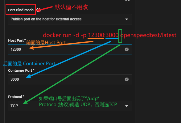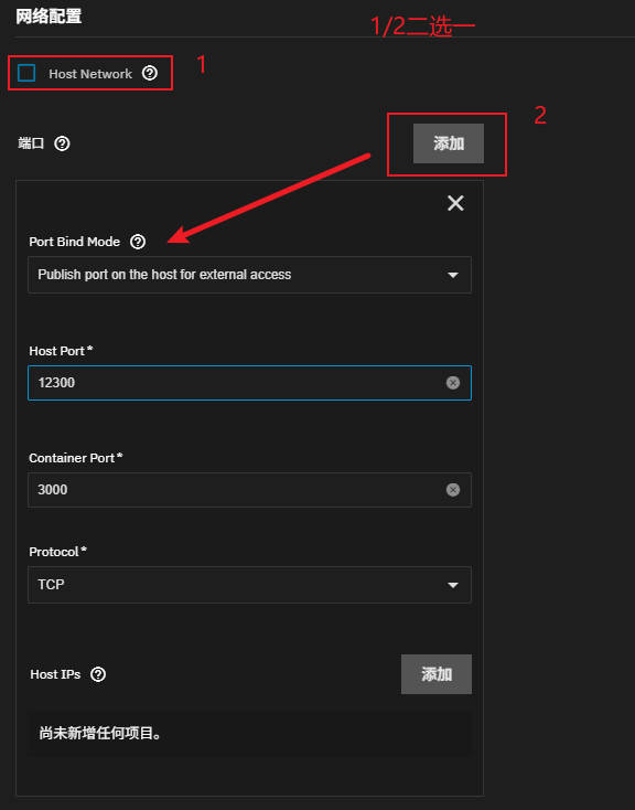 此处涉及一点 Docker 原理,简单的说如果未勾选“Host Network”就需要配置,否则没法从宿主机访问容器内的应用。端口的映射关系可以在应用部署文档中找到,或者直接看 docker run 中的 -p 参数,格式如下: -p 宿主端口:容器内端口/协议 。