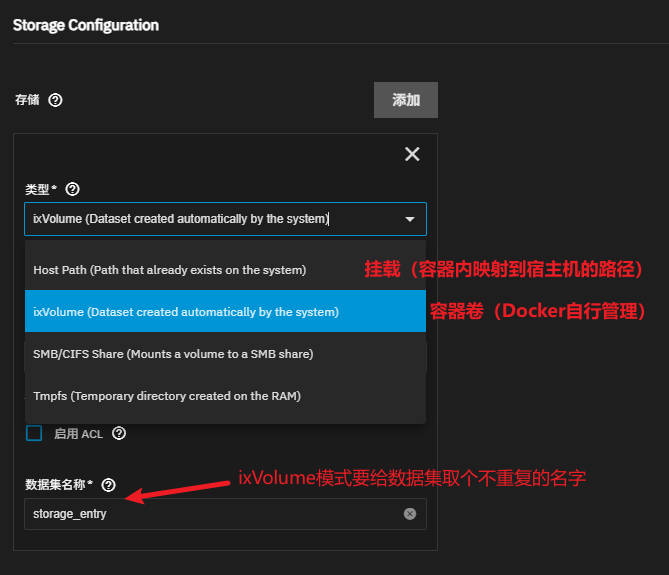 “ixVolume”同 Docker 自行管理的容器卷,不会删除文件,但宿主机无法直接读取。注意选此模式时 TrueNAS 要求手动起一个名字。