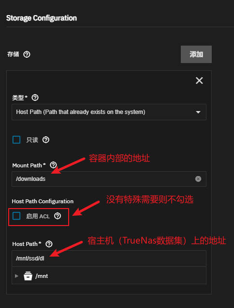 备注:这一部分配置的作用和含义与旧版(K3S)的 TrueNAS 是基本一致。ACL是用于配置文件访问权限的,一般不勾选。