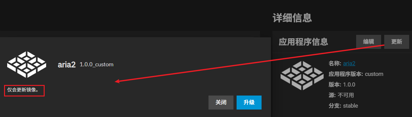 目前的系统版本不能直接通过 Web 管理界面去升级应用。具体来说,首次部署应用后,再点击升级,系统只会拉取新镜像但不会更新应用容器。在 Web 节目上也会有提示。