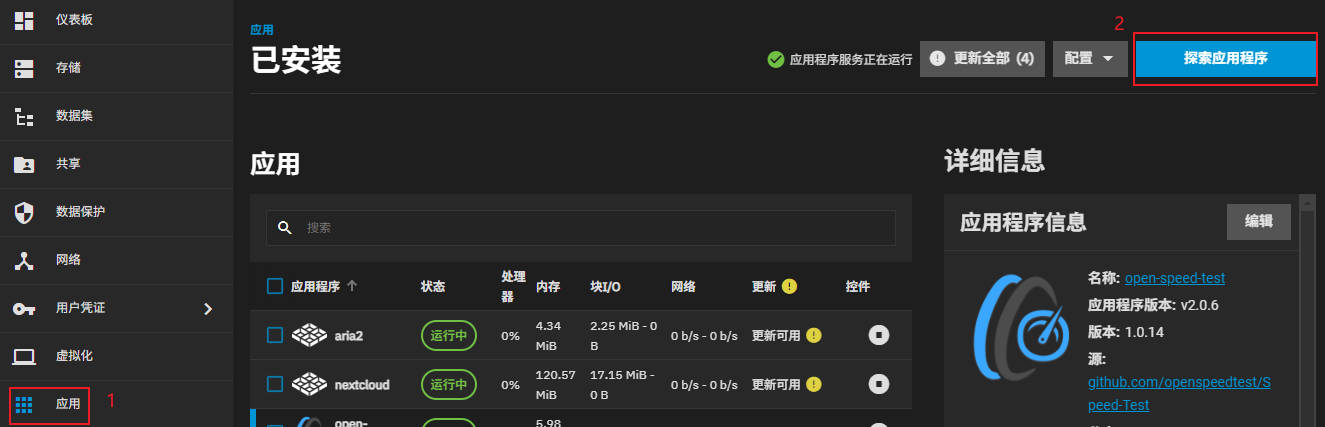 进入 TrueNAS 管理后台,点击 应用 → 探索应用程序。