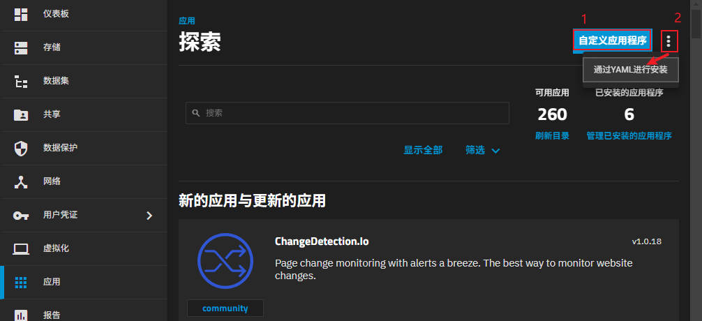 在页面右上方会有两个按钮:“自定义应用程序”(下图中1处)、在折叠菜单中的“通过YAML进行安装”(下图中2处)。选择前者等效于直接通过 docker run 命令部署应用。后者则等效于 docker-compose 方式部署。
